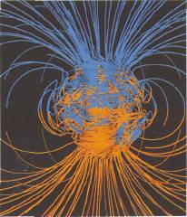 Gezegenimizin manyetik alan şiddetinin yüzeydeki dağılımı. Mavi renk kuzey yönlü, turuncu renk güney